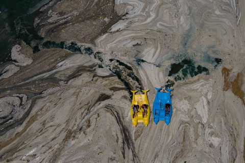 Pedalos berlayar di antara laut Marmara di Turki yang ditutupi dengan ingus laut (12/6). Foto: Yasin AKGUL /AFPBusa tebal, coklat, bergelembung yang dijuluki "ingus laut" itu mengkhawatirkan penduduk Istanbul. Foto: Yasin AKGUL /AFPKementerian Lingkungan Turki bekerja sama dengan Dewan Kota Istanbul meluncurkan operasi untuk mencoba membersihkannya. Foto: Yasin AKGUL /AFPDikutip dari AFP, para ahli mengatakan lendir akan lebih sering muncul karena pemanasan global. Foto: Yasin AKGUL /AFP